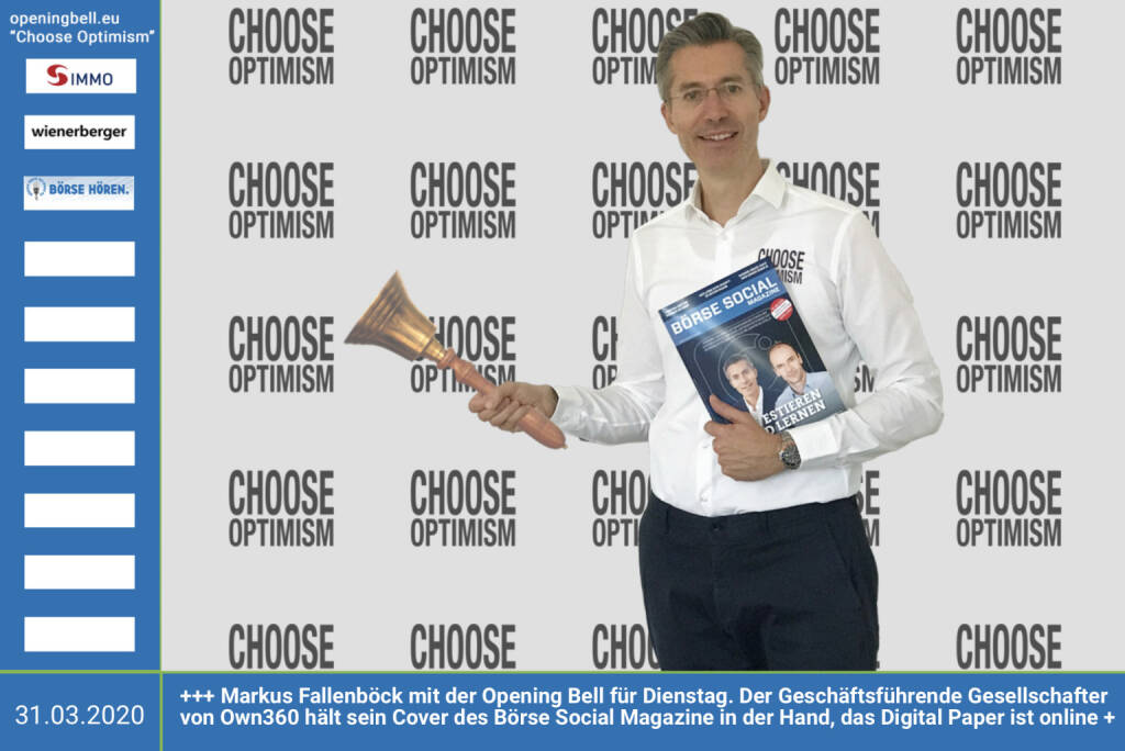 31.3.: Markus Fallenböck läutet die Opening Bell für Dienstag, Long Distance Style (vorher/nachher unter https://photaq.com//page/index/3781 ). Der Geschäftsführende Gesellschafter von Own360 hält "sein" Cover des Börse Social Magazine in der Hand, das Digital Paper ist online https://boerse-social.com/pdf/magazines/bsm_38 mehr Infos unter http://www.openingbell.eu mehr Choose Optimism: https://boerse-social.com/category/choose_optimism https://www.facebook.com/chooseoptimism/