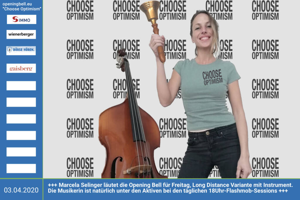 3.4.: Marcela Selinger läutet die Opening Bell für Freitag, Long Distance Variante mit Instrument (vorher/nachher unter https://photaq.com//page/index/3781 ). Die Musikerin ist natürlich unter den Aktiven bei den täglichen 18Uhr-Flashmob-Sessions. Motto: Seid nett zueinander und kommt mich auf meiner Seite http://www.marcy.at besuchen, wenn ihr Lust habt! mehr Infos unter http://www.openingbell.eu mehr Choose Optimism: https://boerse-social.com/category/choose_optimism https://www.facebook.com/chooseoptimism/