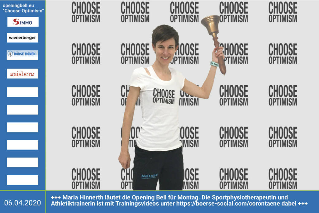 6.4.: Maria Hinnerth läutet die Opening Bell für Montag, Long Distance Variante (vorher/nachher unter https://photaq.com//page/index/3781 ). Die Sportphysiotherapeutin und Athletiktrainerin ist mit Trainingsvideos unter https://boerse-social.com/corontaene dabei https://befit-befast.at +++