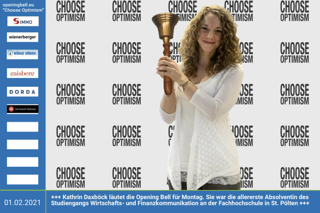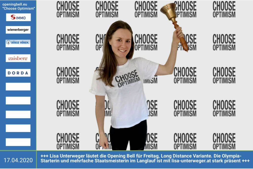 17.4.: Lisa Unterweger läutet die Opening Bell für Freitag, Long Distance Variante (vorher/nachher unter https://photaq.com//page/index/3781 ). Die Olympia-Starterin und mehrfache Staatsmeisterin im Langlauf ist mit lisa-unterweger.at stark präsent mehr Infos unter http://www.openingbell.eu mehr Choose Optimism: https://boerse-social.com/category/choose_optimism https://www.facebook.com/chooseoptimism/