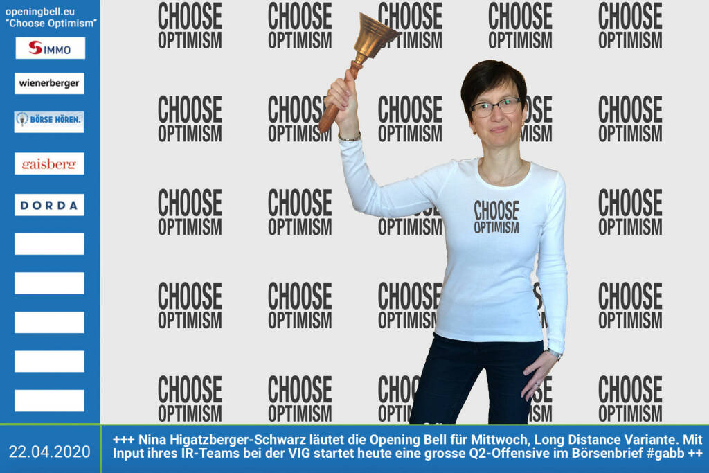 22.4.: Nina Higatzberger-Schwarz läutet die Opening Bell für Mittwoch, Long Distance Variante (vorher/nachher unter https://photaq.com//page/index/3781). Mit Input ihres IR-Teams bei der VIG startet heute eine grosse Q2-Offensive im Börsenbrief #gabb http://www.vig.com http://www.boerse-social.com/gabb mehr Infos unter http://www.openingbell.eu mehr Choose Optimism: https://boerse-social.com/category/choose_optimism https://www.facebook.com/chooseoptimism/