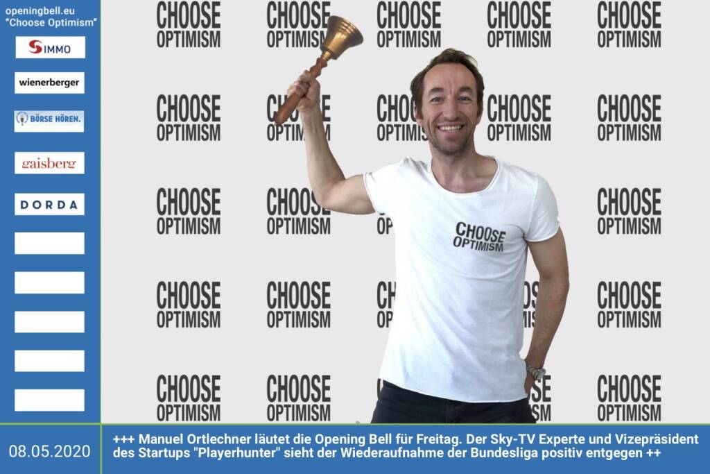 8.5..: Manuel Ortlechner läutet die Opening Bell für Freitag, Long Distance Style (vorher/nachher unter https://photaq.com//page/index/3781). Der Sky-TV Experte und Vizepräsident des Startups "Playerhunter" sieht der Wiederaufnahme der Bundesliga positiv entgegen. http://playerhunter.com mehr Infos unter http://www.openingbell.eu mehr Choose Optimism: https://boerse-social.com/category/choose_optimism https://www.facebook.com/chooseoptimism/
