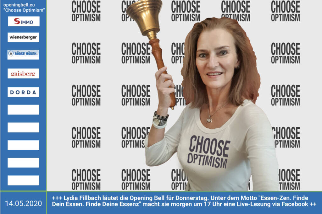 14.5.: Lydia Fillbach läutet die Opening Bell für Donnerstag. Unter dem Motto "Essen-Zen. Finde Dein Essen. Finde Deine Essenz" macht sie morgen um 17 Uhr eine Live-Lesung via Facebook Link: https://www.facebook.com/events/165473354891656/ mehr Infos unter http://www.openingbell.eu mehr Choose Optimism: https://boerse-social.com/category/choose_optimism https://www.facebook.com/chooseoptimism/