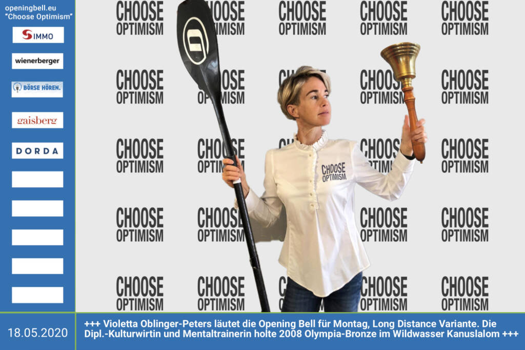 18.5.: Violetta Oblinger-Peters läutet die Opening Bell für Montag, Long Distance Variante (vorher/nachher unter https://photaq.com//page/index/3781). Die Dipl.-Kulturwirtin und Mentaltrainerin holte 2008 Olympia-Bronze im Wildwasser Kanuslalom http://www.wildwater.at/ mehr Infos unter http://www.openingbell.eu mehr Choose Optimism: https://boerse-social.com/category/choose_optimism https://www.facebook.com/chooseoptimism/