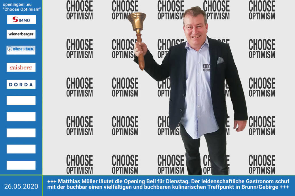 26.5.: Matthias Müller läutet die Opening Bell für Dienstag,. (vorher/nachher unter https://photaq.com//page/index/3781). Der leidenschaftliche Gastronom schuf mit der buchbar einen vielfältigen und buchbaren kulinarischen Treffpunkt in Brunn/Gebirge https://buch-bar.at/ mehr Infos unter http://www.openingbell.eu mehr Choose Optimism: https://boerse-social.com/category/choose_optimism https://www.facebook.com/chooseoptimism/