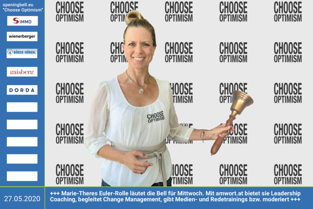 27.5.: Marie-Theres Euler-Rolle läutet die Opening Bell für Mittwoch, Long Distance Style (vorher/nachher unter https://photaq.com//page/index/3781). Mit http://www.amwort.at bietet sie u.a. Strategisches Leadership Coaching, begleitet Change Management, gibt Medien- und Redetrainings bzw. moderiert mehr Infos unter http://www.openingbell.eu mehr Choose Optimism: https://boerse-social.com/category/choose_optimism https://www.facebook.com/chooseoptimism/
