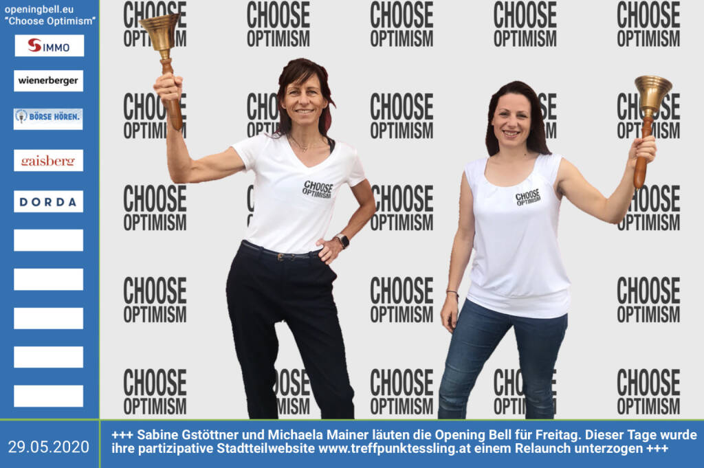 29.5.: Sabine Gstöttner und Michaela Mainer läuten die Opening Bell(s) für Freitag, Long Distance Style (vorher/nachher unter https://photaq.com//page/index/3781). Dieser Tage wurde ihre partizipative Stadtteilwebsite http://www.treffpunktessling.at einem Relaunch unterzogen mehr Infos unter http://www.openingbell.eu mehr Choose Optimism: https://boerse-social.com/category/choose_optimism https://www.facebook.com/chooseoptimism/