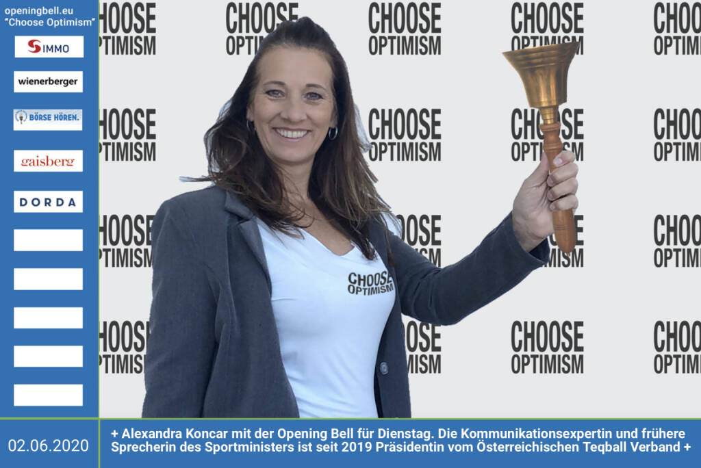 2.6.: Alexandra Koncar läutet die Opening Bell für Dienstag, Long Distance Style (vorher/nachher unter https://photaq.com//page/index/3781). Die frühere Sprecherin des Sportministers ist Kommunikations- und Medienexpertin (http://www.ah-life.at) und ist seit dem Vorjahr Präsidentin vom Österreichischen Teqball Verband . Mehr unter http://www.teqball-austria.at und in der ORF-TV-Thek https://tvthek.orf.at/profile/Sport-Bild/1379/Sport-... bzw. heute um 20:15 Uhr in ORF Sport Plus (2 Stunden Teqball mit u.a. ÖFB-Star Nina Burger und Lizz Görgl)