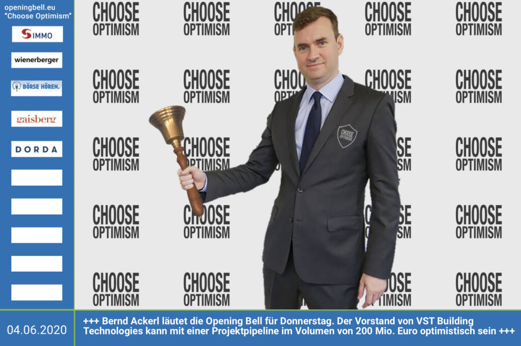4.6.: Bernd Ackerl läutet die Opening Bell für Donnerstag, Long Distance Style (vorher/nachher unter https://photaq.com//page/index/3781). Der Vorstand von VST Building Technologies kann mit einer Projektpipeline im Volumen von 200 Mio. Euro optimistisch sein https://vstbuildingtechnologies.commehr Infos unter http://www.openingbell.eu mehr Choose Optimism: https://boerse-social.com/category/choose_optimism https://www.facebook.com/chooseoptimism/