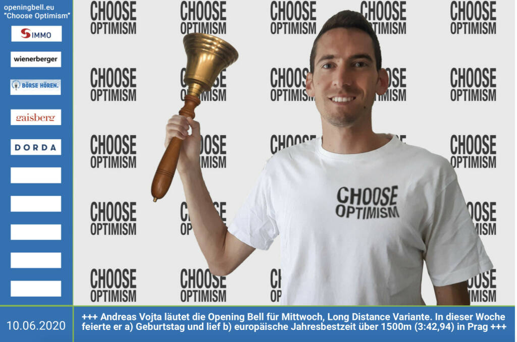 10.6.: Andreas Vojta läutet die Opening Bell für Mittwoch, Long Distance Variante (vorher/nachher unter https://photaq.com//page/index/3781). In dieser Woche feierte er a) Geburtstag und lief b) europäische Jahresbestzeit über 1500m (3:42,94) in Prag. 2x Gratulation https://laufheld.com http://www.sportgeschichte.at mehr Infos unter http://www.openingbell.eu mehr Choose Optimism: https://boerse-social.com/category/choose_optimism https://www.facebook.com/chooseoptimism/