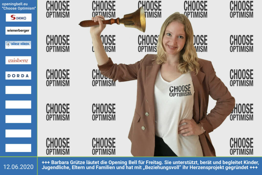 12.6.: Barbara Grütze läutet die Opening Bell für Freitag, Long Distance Style (vorher/nachher unter https://photaq.com//page/index/3781). Sie unterstützt, berät und begleitet Kinder, Jugendliche, Eltern und Familien und hat mit „Beziehungsvoll“ ihr Herzensprojekt gegründet http://www.beziehungsvoll.at mehr Infos unter http://www.openingbell.eu mehr Choose Optimism: https://boerse-social.com/category/choose_optimism https://www.facebook.com/chooseoptimism/