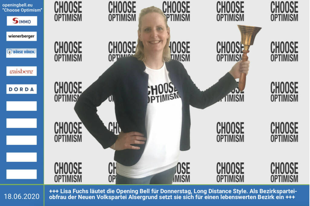 18.6.: Lisa Fuchs läutet die Opening Bell für Donnerstag, Long Distance Style (vorher/nachher unter https://photaq.com//page/index/3781). Als Bezirksparteiobfrau der Neuen Volkspartei Alsergrund setzt sich die begeisterte Alsergrunderin für einen lebenswerten Bezirk ein https://neuevolkspartei.wien/bezirke/alsergrund/ mehr Infos unter http://www.openingbell.eu mehr Choose Optimism: https://boerse-social.com/category/choose_optimism https://www.facebook.com/chooseoptimism/