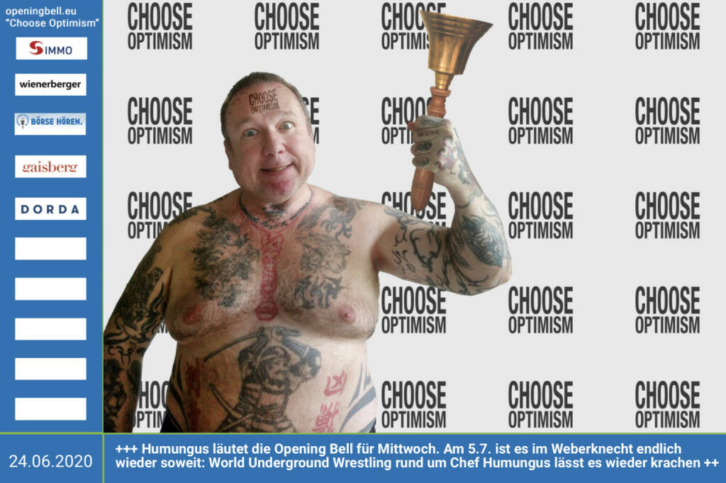 24.6.: Humungus läutet die Opening Bell für Mittwoch, Long Distance Style (vorher/nachher unter https://photaq.com//page/index/3781). Nach langer Durststrecke ist es am 5.7. im Weberknecht - siehe http://www.wrestlingschoolaustria.at/events05jul20.htm - endlich wieder soweit: Die Publikumslieblinge der World Underground Wrestling – hier im Bild Humungus, ihr Chef – lassen es wieder krachen! In die Goschn! Humungus freut sich über Österreichs erstes Wrestling-Magazin "In die Goschn", das im Herbst erstmalig erscheinen wird. mehr Infos unter http://www.openingbell.eu mehr Choose Optimism: https://boerse-social.com/category/choose_optimism https://www.facebook.com/chooseoptimism/ Humungus: „Da kommt noch einiges auf uns zu! Challenge accepted?“
