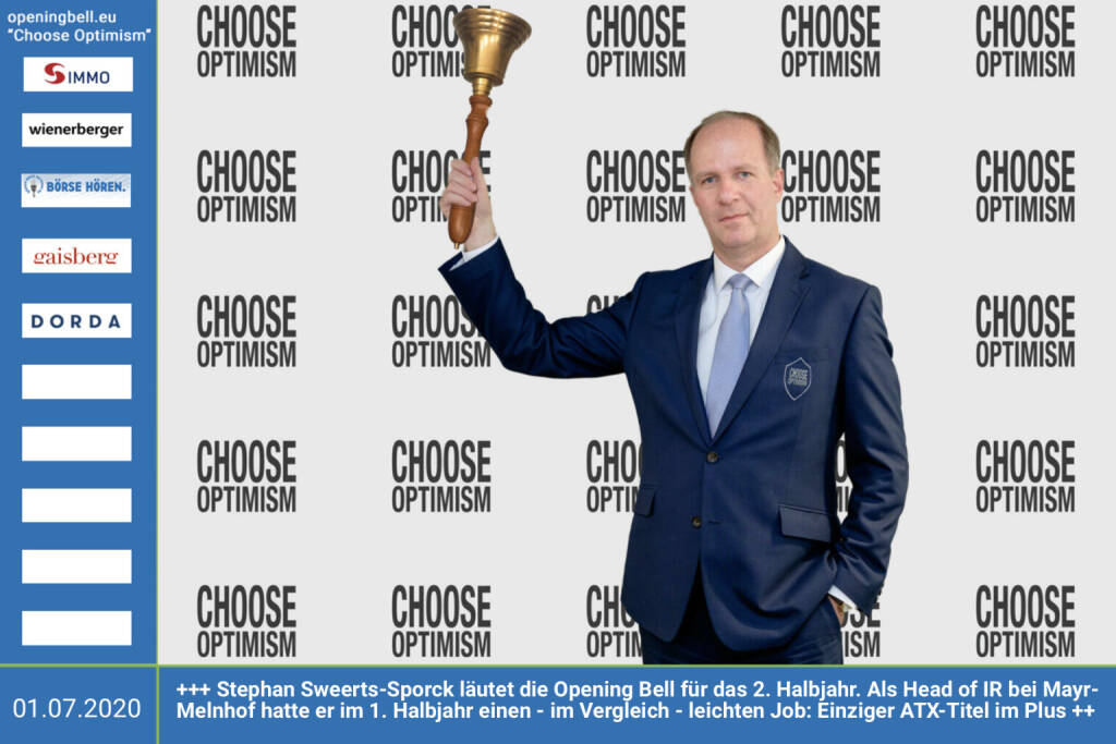 1.7.: Stephan Sweerts-Sporck läutet die Opening Bell für Mittwoch und das 2. Halbjahr, Long Distance Style (vorher/nachher unter https://photaq.com//page/index/3781). Als Head of Investor Relations /Corporate Communication bei Mayr-Melnhof hatte er im 1. Halbjahr einen - im Vergleich - leichten Job: Einziger ATX-Titel im Plus http://mayr-melnhof.com mehr Infos unter http://www.openingbell.eu mehr Choose Optimism: https://boerse-social.com/category/choose_optimism https://www.facebook.com/chooseoptimism/