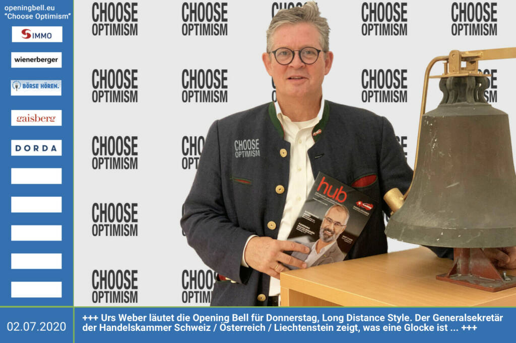2.7.: Urs Weber läutet die Opening Bell für Donnerstag, Long Distance Style (vorher/nachher unter https://photaq.com//page/index/3781). Der Generalsekretär der Handelskammer Schweiz / Österreich / Liechtenstein zeigt, was eine Glocke ist ... http://www.hk-schweiz.at mehr Infos unter http://www.openingbell.eu mehr Choose Optimism: https://boerse-social.com/category/choose_optimism https://www.facebook.com/chooseoptimism/
