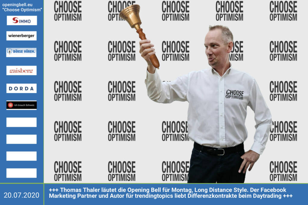 20.7.: Thomas Thaler läutet die Opening Bell für Montag, Long Distance Style (vorher/nachher unter https://photaq.com//page/index/3781). Der Facebook Marketing Partner und Autor für trendingtopics liebt Differenzkontrakte beim Daytrading http://www.inspirit.at http://www.trendingtopics.at/spread-bid-leverage-so-funktio... http://www.openingbell.eu mehr Choose Optimism: https://boerse-social.com/category/choose_optimism https://www.facebook.com/chooseoptimism/