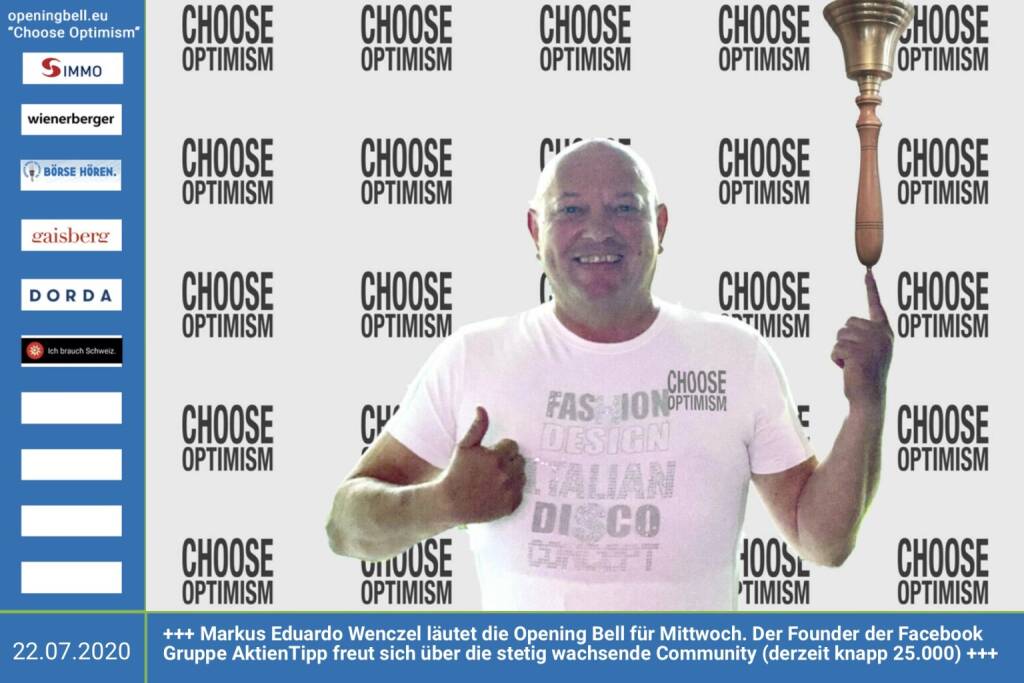 22.7.: Markus Eduardo Wenczel läutet die Opening Bell für Mittwoch, Long Distance Style (vorher/nachher unter https://photaq.com//page/index/3781). Der Founder der Facebook Gruppe AktienTipp freut sich über die stetig wachsende Community (derzeit knapp 25.000) https://www.facebook.com/groups/aktientip https://aktien-tipp.com http://www.openingbell.eu mehr Choose Optimism: https://boerse-social.com/category/choose_optimism https://www.facebook.com/chooseoptimism/