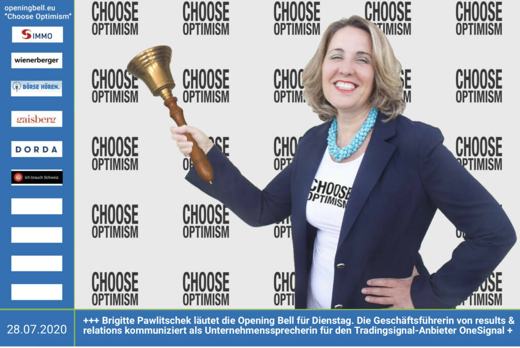 28.7.: Brigitte Pawlitschek läutet die Opening Bell für Dienstag, Long Distance Style (vorher/nachher unter https://photaq.com//page/index/3781). Die Geschäftsführerin von results & relations kommuniziert seit kurzem für den Tradingsignal-Anbieter OneSignal https://www.one-signal.com/de https://www.results.at/ http://www.openingbell.eu mehr Choose Optimism: https://boerse-social.com/category/choose_optimism https://www.facebook.com/chooseoptimism/