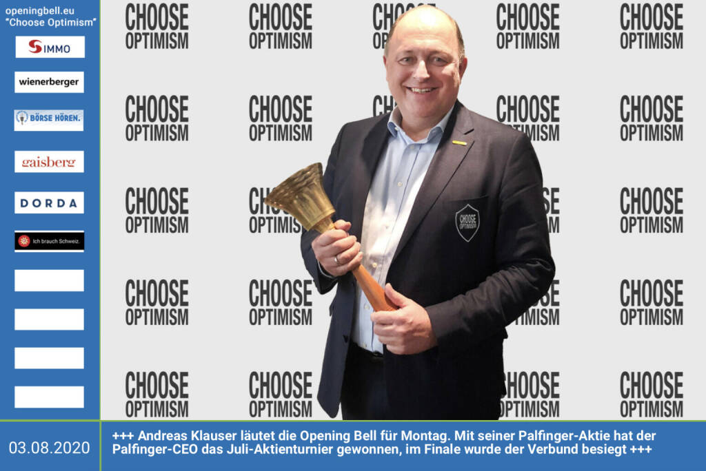 3.8.: Andreas Klauser läutet die Opening Bell für Montag. Mit seiner Palfinger-Aktie hat der Palfinger-CEO das Juli-Aktienturnier gewonnen, im Finale wurde der Verbund besiegt http://www.palfinger.com http://www.boerse-social.com/tournament http://www.openingbell.eu mehr Choose Optimism: https://boerse-social.com/category/choose_optimism https://www.facebook.com/chooseoptimism/
