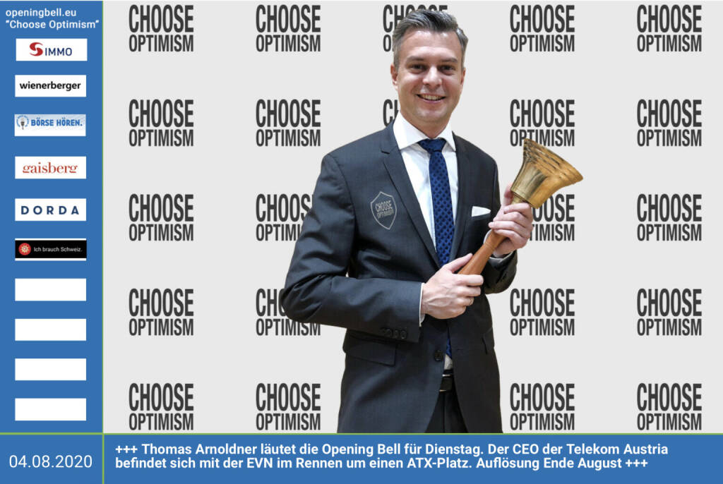 4.8.: Thomas Arnoldner läutet die Opening Bell für Dienstag. Der CEO der Telekom Austria befindet sich mit der EVN im Rennen um einen ATX-Platz. Auflösung Ende August http://www.openingbell.eu mehr Choose Optimism: https://boerse-social.com/category/choose_optimism https://www.facebook.com/chooseoptimism/
