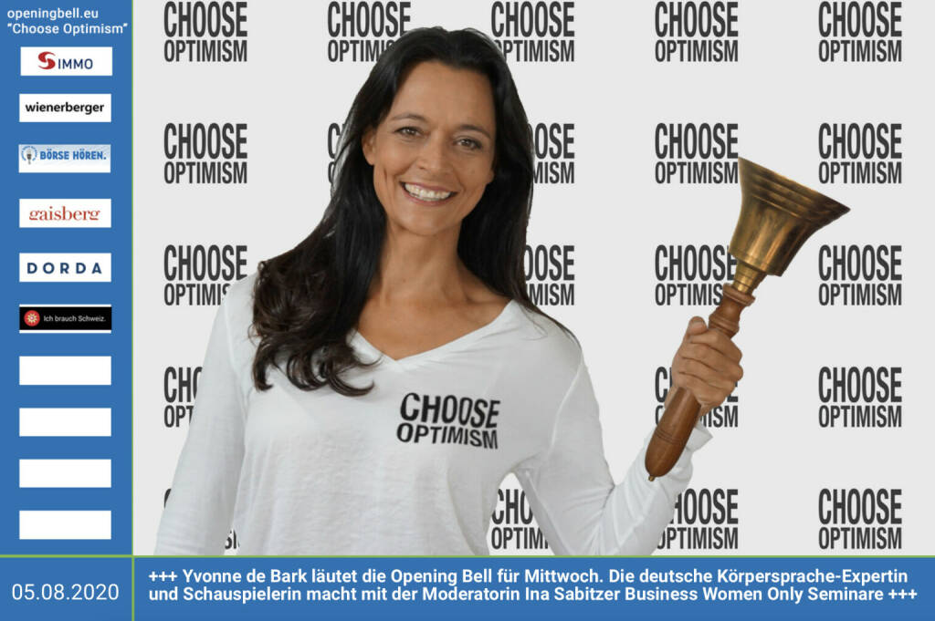5.8.: Yvonne de Bark läutet die Opening Bell für Mittwoch (Long Distance Style, vorher/nachher unter https://photaq.com//page/index/3781). Die deutsche Schauspielerin und Körpersprache-Expertin, die seit Jahren auch Manager und Politiker coacht, macht im Herbst 2020 gemeinsam mit der österreichischen Positionierungs-Expertin und Moderatorin Ina Sabitzer Business Women Only Seminare zum Thema Image und Wirkung. In Yvonnes aktuellem Podcast „Wirke wie du willst“ haben die beiden mehr zu Image und Wirkung sowie ihrem Frauen-Seminar in Wien erzählt. https://youtu.be/C-XCvOK3FgM Nähere Infos zu den Seminaren unter: www.inasabitzer.at/empower-women-now http://www.openingbell.eu mehr Choose Optimism: https://boerse-social.com/category/choose_optimism https://www.facebook.com/chooseoptimism/