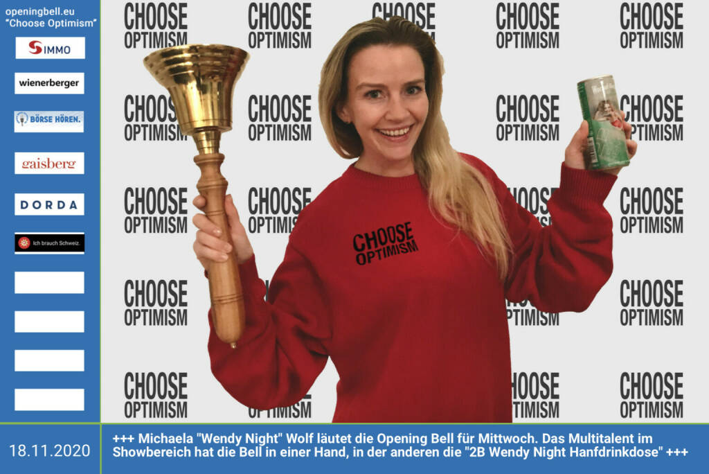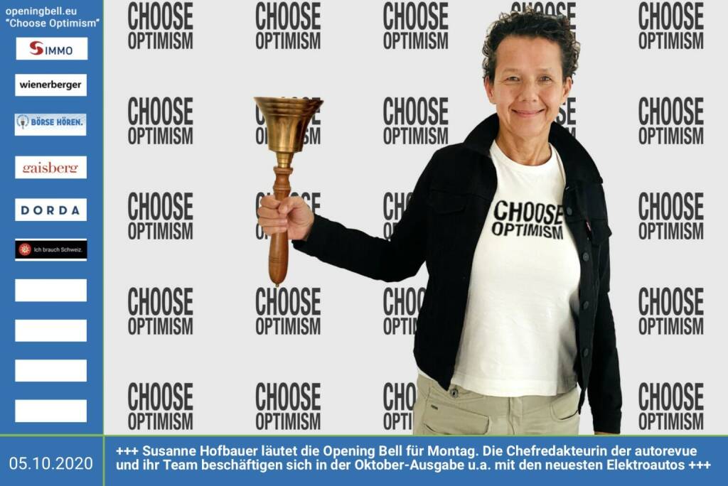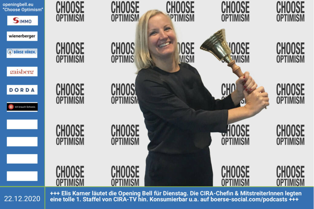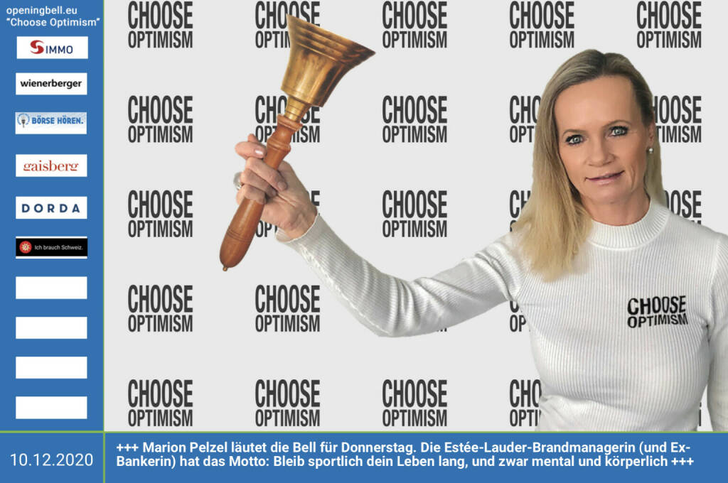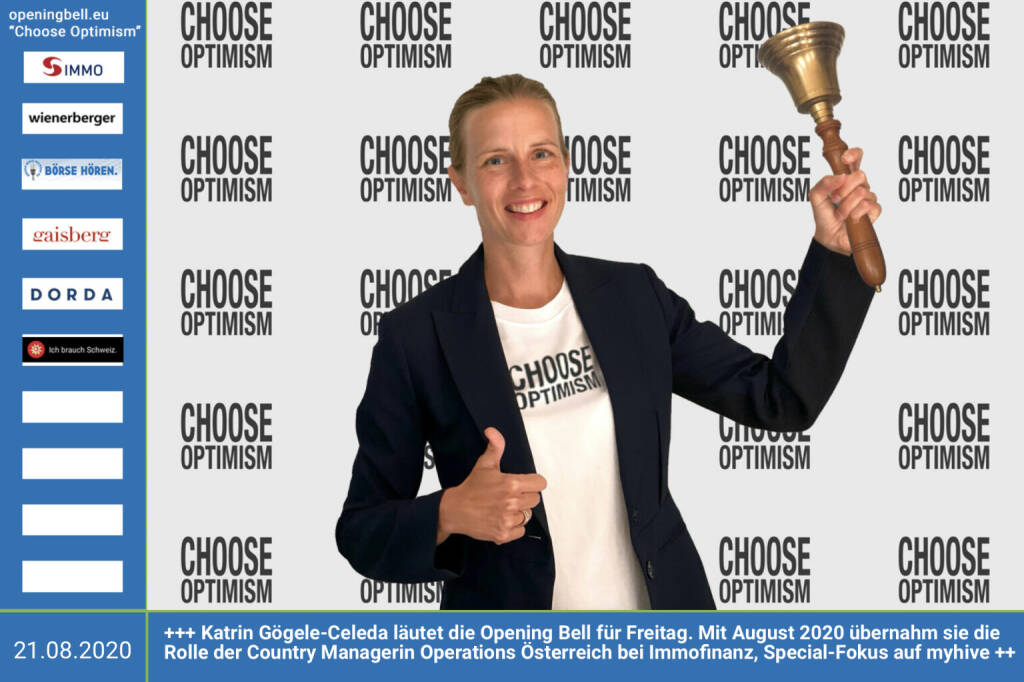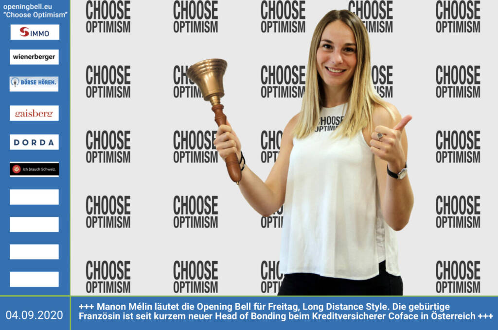 3.7.: Dorothee Bauer läutet die Opening Bell für Freitag, Long Distance Style (vorher/nachher unter https://photaq.com//page/index/3781). Auch wenn Selbstständige während des Lockdowns bis auf letzte Hemd ausgezogen wurden, behalten sie die Hosen an. Das Schild (ohne Choose Optimism drauf) gibts unter https://www.deliciouswedding.at https://www.lapapeteria.at mehr Infos unter http://www.openingbell.eu mehr Choose Optimism: https://boerse-social.com/category/choose_optimism https://www.facebook.com/chooseoptimism/