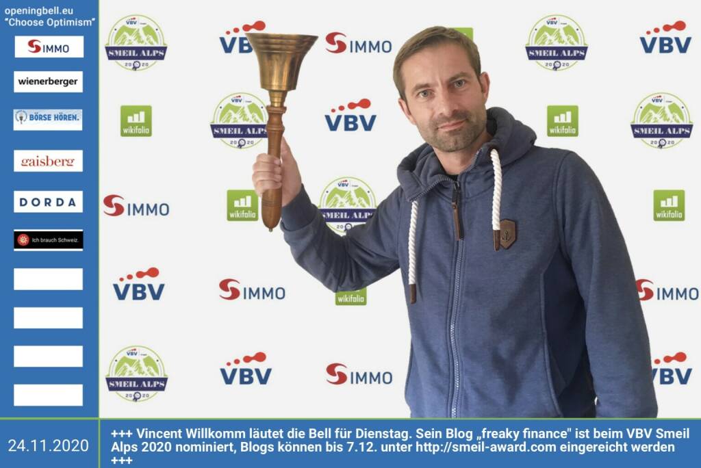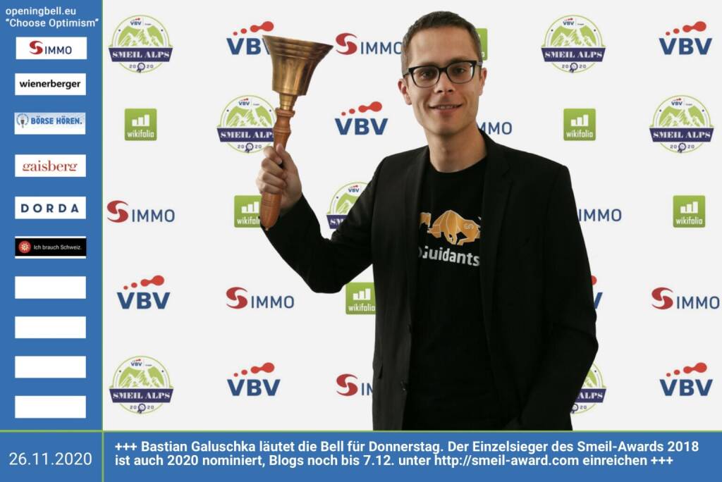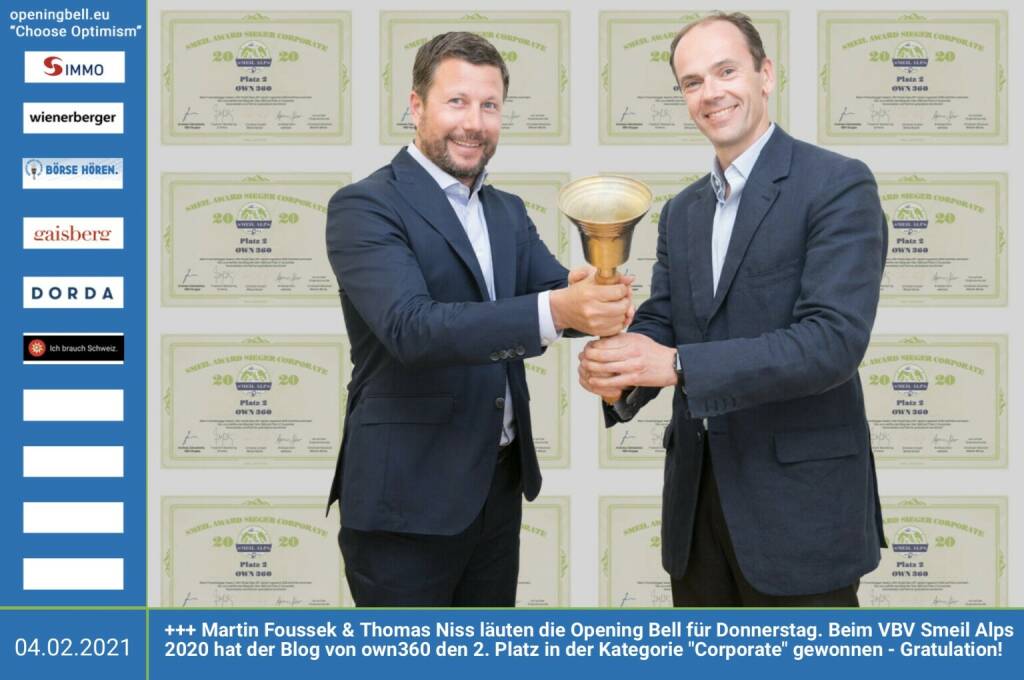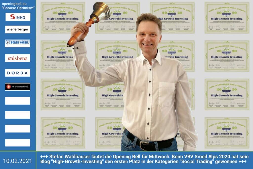 10.2.: Stefan Waldhauser läutet die Opening Bell für Mittwoch. Beim VBV Smeil Alps 2020 hat sein Blog "High-Growth-Investing" den ersten Platz in der Kategorien "Social Trading" gewonnen - Gratulation! http://high-tech-investing.de http://smeil-award.com http://vbv.at