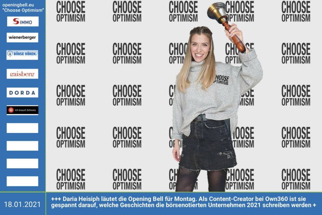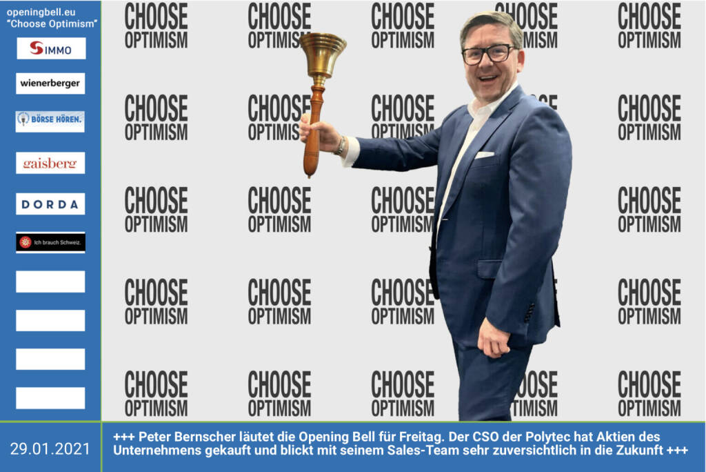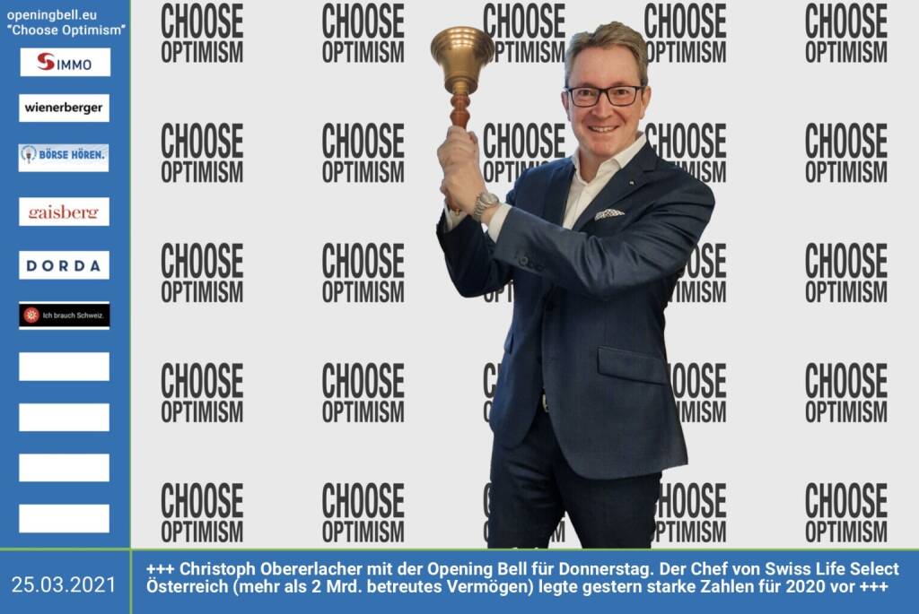 25.3.: Christoph Obererlacher läutet die Opening Bell für Donnerstag. Der Chef von Swiss Life Select Österreich (mehr als 2 Mrd. betreutes Vermögen) legte gestern starke Zahlen für 2020 vor. Dazu werden wir uns im nächsten monatlichen Cheftalk (https://boerse-social.com/search/obererlacher) ausführlich unterhalten https://www.swisslife-select.at/home.html Choose Optimism: https://boerse-social.com/category/choose_optimism https://www.facebook.com/chooseoptimism/