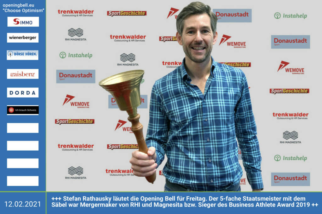 12.2.: Stefan Rathausky läutet die Opening Bell für Freitag. Der 5-fache Staatsmeister mit dem Säbel war Mergermaker von RHI und Magnesita bzw. Sieger des Business Athlete Award 2019 , sein Nachfolger wird kommende Woche geoutet https://www.rhimagnesita.com/de/ http://www.sportgeschichte.at/baa