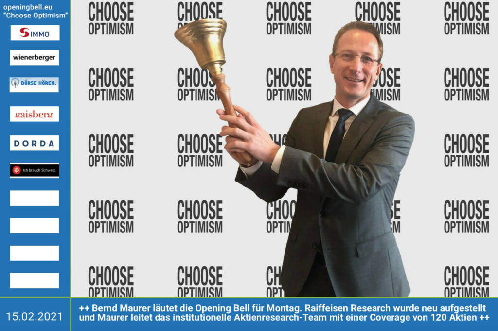 15.2.: Bernd Maurer läutet die Opening Bell für Montag. Raiffeisen Research wurde neu aufgestellt und Maurer leitet das institutionelle Aktienresearch-Team mit einer Coverage von 120 Aktien. https://www.raiffeisenresearch.com/