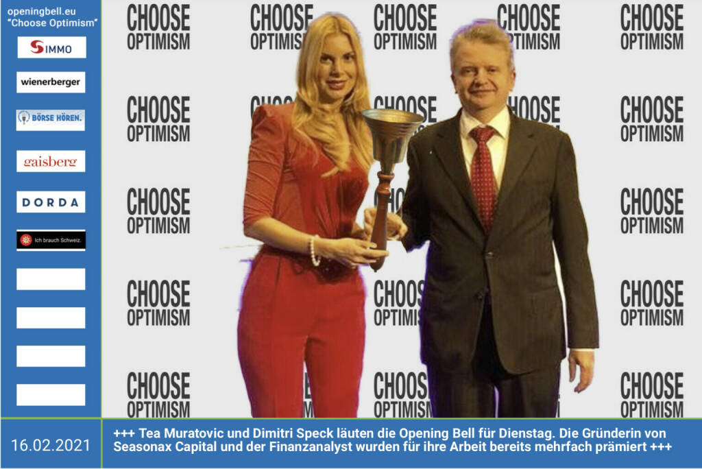 16.2.: Tea Muratovic und Dimitri Speck läuten die Opening Bell für Dienstag. Die Co-Gründer von Seasonax Capital wurden für ihre Arbeit bereits mehrfach prämiert http://www.seasonax.com , http://www.seasonax-capital.com - mehr Choose Optimism: https://boerse-social.com/category/choose_optimism https://www.facebook.com/chooseoptimism/