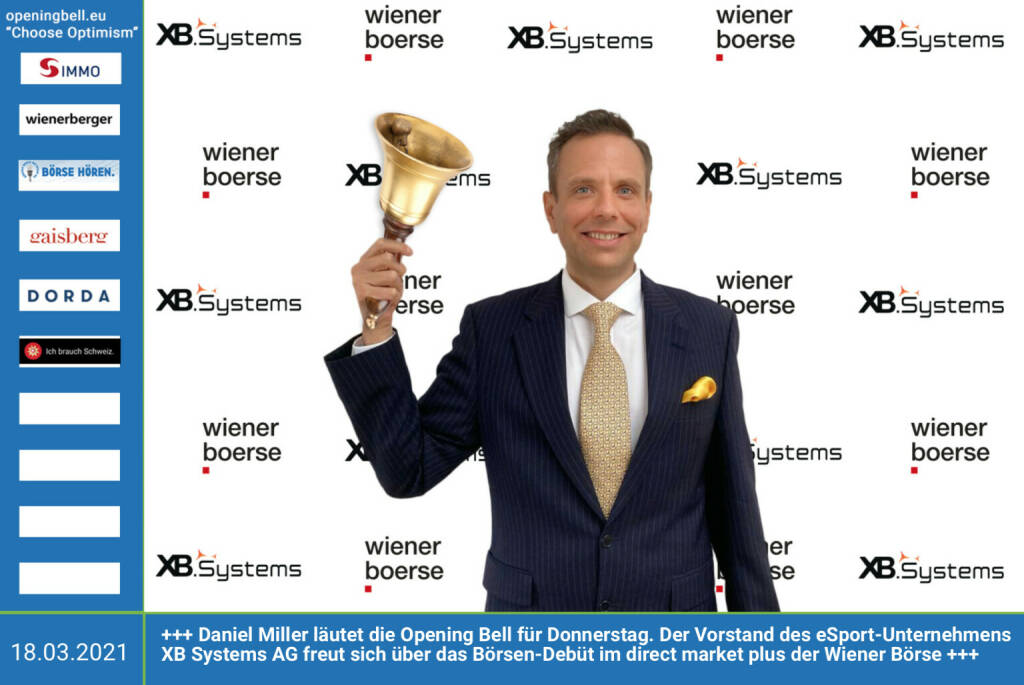 18.3.: Daniel Miller läutet die Opening Bell für Donnerstag. Der Vorstand des eSport-Unternehmens XB Systems AG freut sich über das Börsen-Debüt im direct market plus der Wiener Börse. https://www.facebook.com/chooseoptimism/