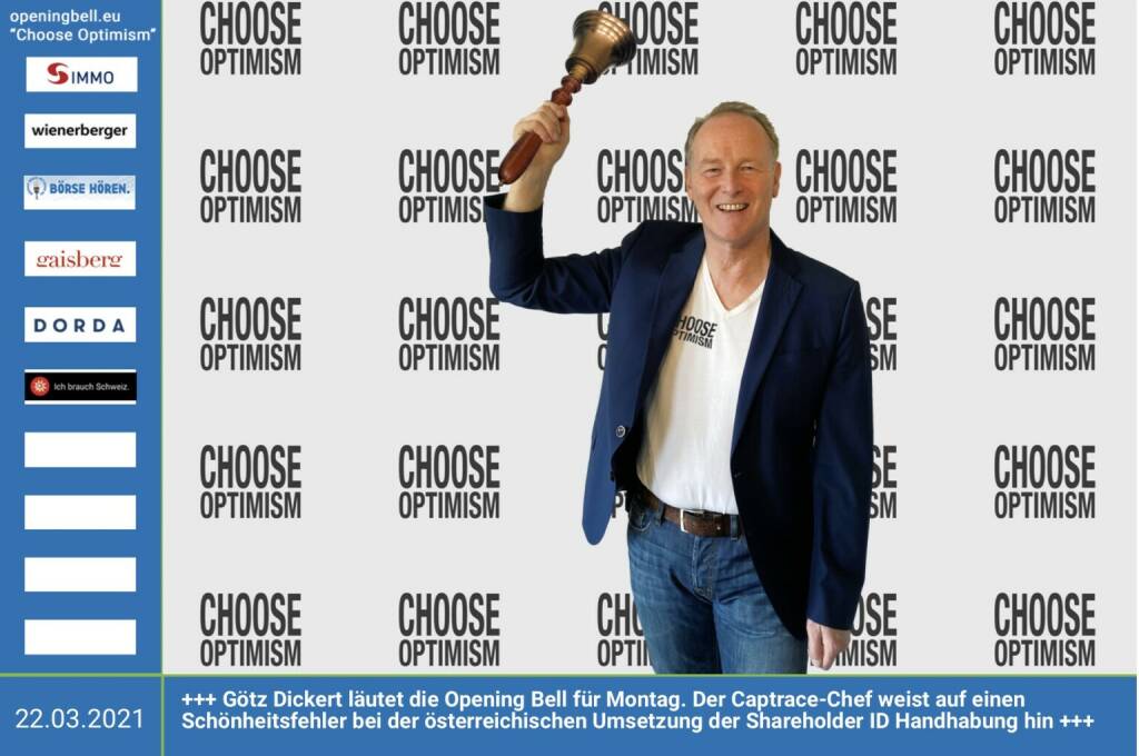 22.3.: Götz Dickert läutet die Opening Bell für Montag. Der Captrace-Chef weist auf einen Schönheitsfehler bei der österreichischen Umsetzung der Shareholder ID Handhabung hin, siehe hier: https://boerse-social.com/2021/03/18/shareholder_id_toll... https://www.captrace.de https://www.facebook.com/chooseoptimism/