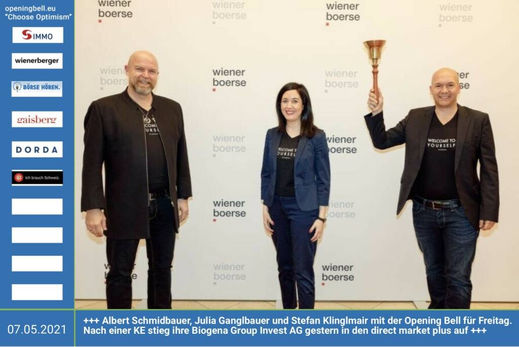 7.5.: Albert Schmidbauer, Julia Ganglbauer und Stefan Klinglmair mit der Opening Bell für Freitag. Nach einer KE stieg ihre Biogena Group Invest AG gestern in den direct market plus auf ttps://www.biogena.com/de-DE/at/index.html http://www.wienerborse.at Choose Optimism: https://boerse-social.com/category/choose_optimism https://www.facebook.com/chooseoptimism/ Choose Optimism: https://boerse-social.com/category/choose_optimism https://www.facebook.com/chooseoptimism/