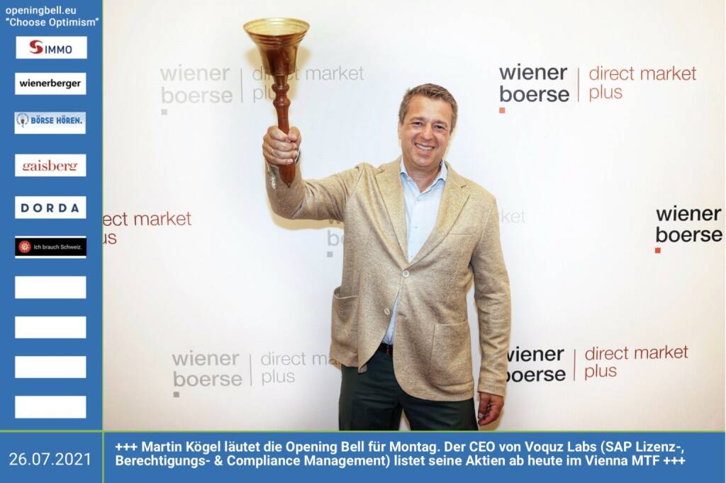 26.7.: Martin Kögel läutet die Opening Bell für Montag. Der CEO von Voquz Labs ( SAP Lizenz-, Berechtigungs- & Compliance Management) listet seine Aktien ab heute im Vienna MTF http://www.voquzlabs.com http://www.wienerborse.at