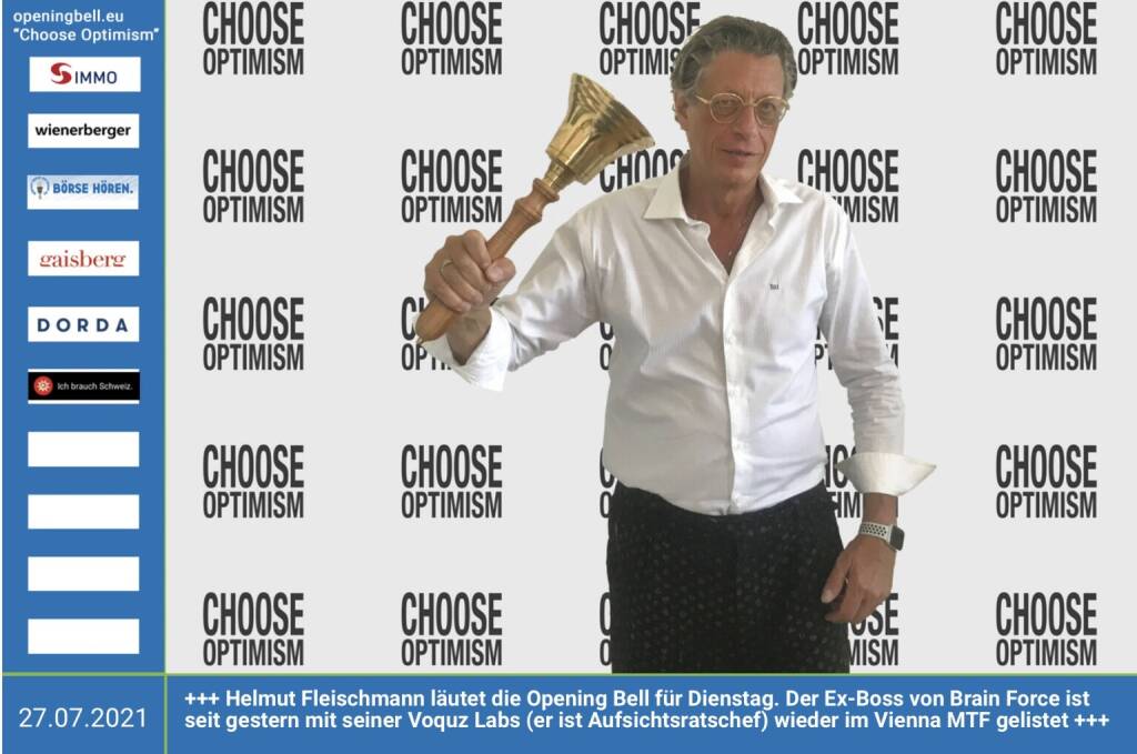 27.7.: Helmut Fleischmann läutet die Opening Bell für Dienstag. Der Ex-Boss von Brain Force ist seit gestern mit seiner Voquz Labs (er ist Aufsichtsratschef) wieder im Vienna MTF gelistet http://www.voquzlabs.com http://www.wienerborse.at Choose Optimism: https://boerse-social.com/category/choose_optimism https://www.facebook.com/chooseoptimism/