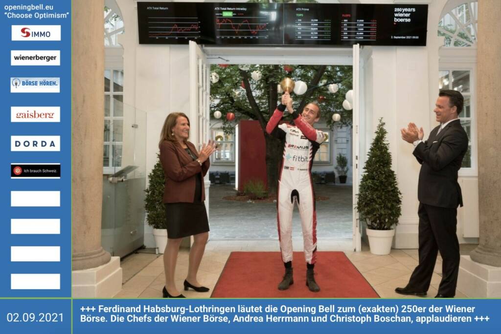 2.9.: Ferdinand Habsburg-Lothringen läutet die Opening Bell zum (exakten) 250er der Wiener Börse. Die Chefs der Wiener Börse, Andrea Herrmann und Christoph Boschan, applaudieren http://www.wienerborse.at http://www.boersegeschichte.at