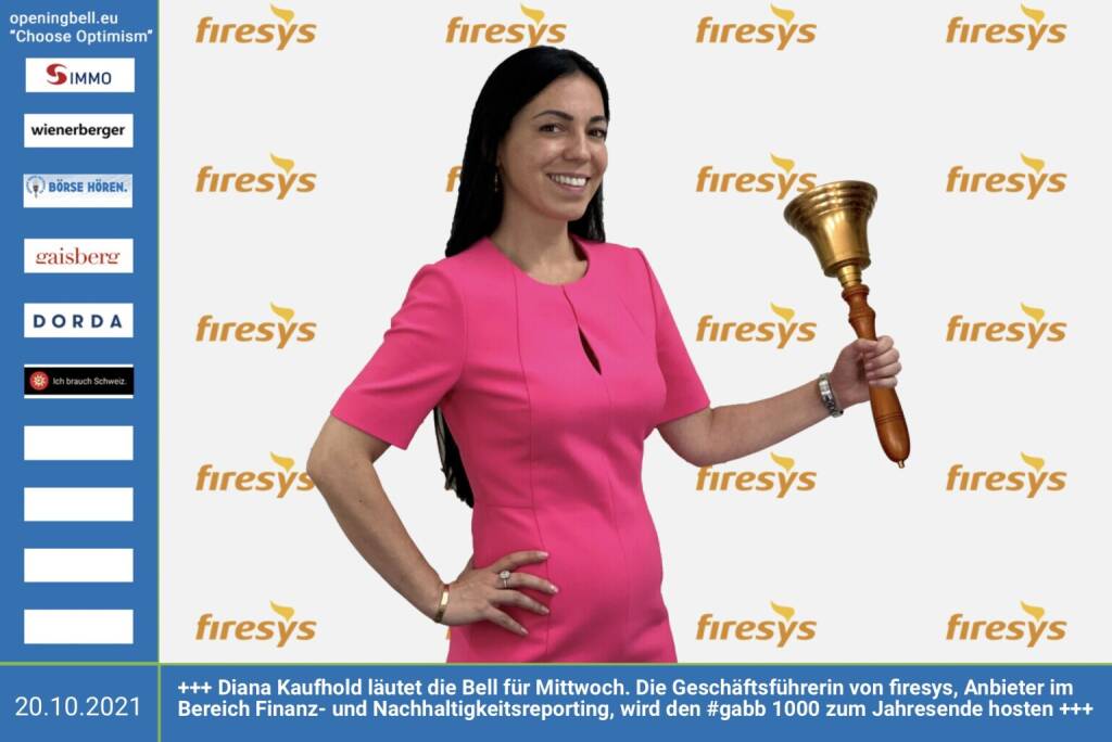 20.10.: Diana Kaufhold läutet die Opening Bell für Mittwoch. Die Geschäftsführerin von firesys, Anbieter im Bereich Finanz- und Nachhaltigkeitsreporting, wird den #gabb 1000 (Jubiläumsausgabe, bei der der lässigste Moment in 250 Jahren Wiener Börsegeschichte gekürt wird) zum Jahresende hosten. Und: Happy Birthday, Diana, zum heutigen Geburtstag! https://www.firesys.de/unternehmen https://www.boerse-social.com/gabb
