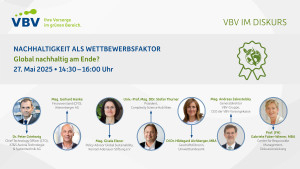 "VBV im Diskurs" ist unser Ansatz, bei dem wir uns als Nachhaltigkeits-Pionier gemeinsam mit der Expertin Gabriele Faber-Wiener und namhaften Gästen aus Wirtschaft, Politik und Wissenschaft den brennendsten Fragen der Gegenwart stellen. Der Titel der Veranstaltung am 27. Mai, 14.30 bis 16 Uhr, lautet: "Nachhaltigkeit als Wettbewerbsfaktor - Global nachhaltig am Ende?" Kostenlose Anmeldung hier:
