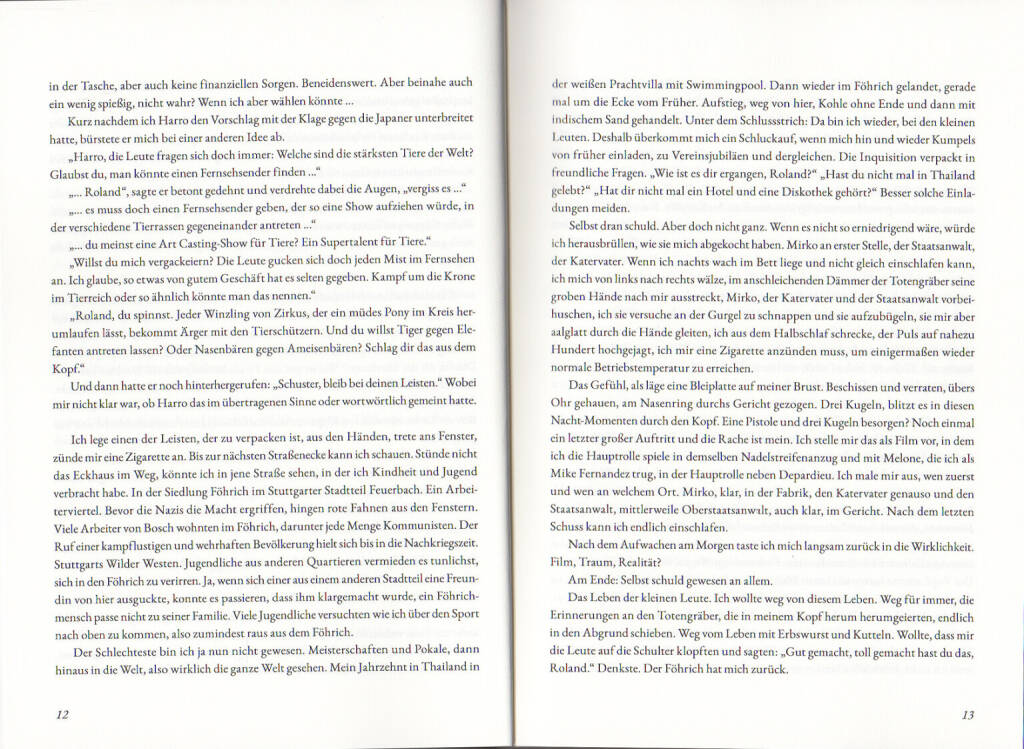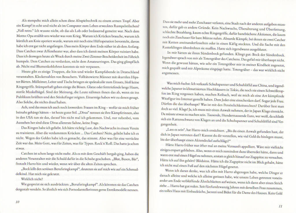 Eine unglaubliche, prall gefüllte Roman-Biographie, die für mehrere Leben reicht. Misshandlungen in der Kindheit im Nachkriegs-Deutschland. Olympia, Catcher-Karriere, im Kampf gegen Bär und Stier, vor der Film-Kamera neben Gerard Depardieu, abenteuerliche Geschäftsideen, hinter Gittern, die vergebliche Suche nach der richtigen Frau, Leben im Paradies und die brutale Landung in der Vergangenheit. Von Verzweiflung und Hoffnung und Höhenflug. Vom Irrsinn zum Wahnsinn. Da hat die heile Welt nicht immer Platz.