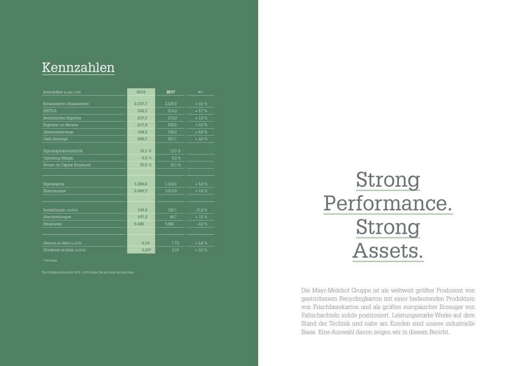 Strong Performance. Strong Assets. - Die Mayr-Melnhof Gruppe ist als weltweit größter Produzent von gestrichenem Recyclingkarton mit einer bedeutenden Produktion von Frischfaserkarton und als größter europäischer Erzeuger von Faltschachteln solide positioniert. Leistungsstarke Werke auf dem Stand der Technik und nahe am Kunden sind unsere industrielle Basis. Eine Auswahl davon zeigen wir in diesem Bericht.