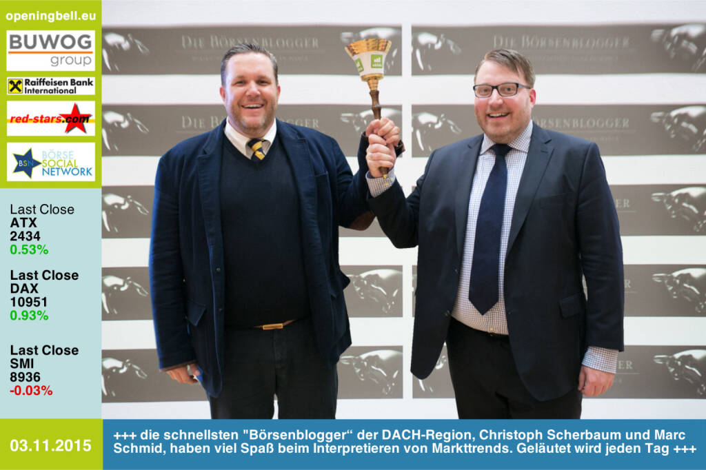 Opening Bell todaq: Christoph und Marc haben bei uns 2014 den http://www.smeil-award.com gegen mehr als 100 Konkurrenten gewonnen, sind einfach die schnellsten Journalisten bei börslichen Markttrends und läuten die Glocke im Duett wie zwei chinesische Glückskatzen. Und die Generalprobe einen Tag vor dem Shooting war mit eine der witzigsten Aktionen 2015. Dazu vielleicht später mal. Für 2016 haben wir einiges gemeinsam geplant. http://www.openingbell.eu Choose Optimism Börse Social Network