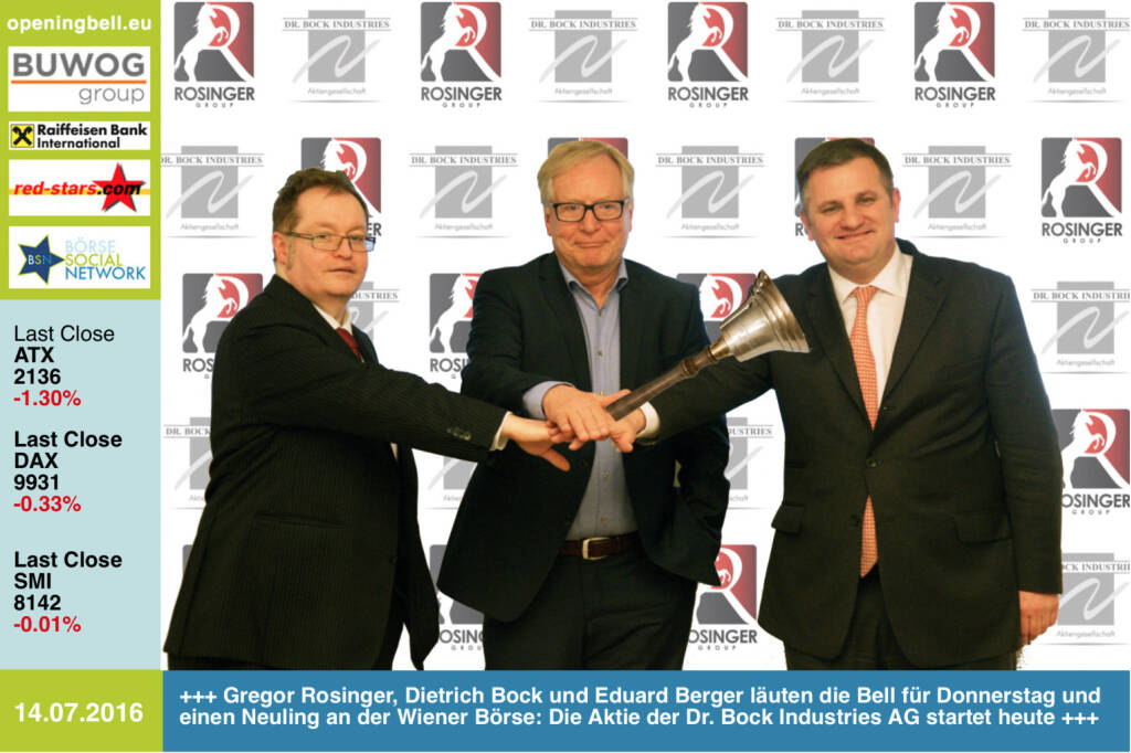 "Das Unternehmen Dr. Bock Industries AG wurde heute in den Dritten Markt der Wiener Börse einbezogen. Damit ist die Wiener Börse der exklusive Handelsplatz für die Aktien des Unternehmens. Die Aktien können in einer einmaligen untertägigen Auktion gehandelt werden. Laut Unternehmensangaben ist die Dr. Bock Industries AG eine deutsche Holding mit Tochtergesellschaften in Italien (RGT Italia), Deutschland (RGT Deutschland GmbH), Ukraine (RGT Ukraine) und Rumänien (RGT Romania). Der Dienstleister ist auf die Produktion hochwertiger Bekleidung spezialisiert. „Um auch in Zukunft gesund wachsen zu können, haben wir im vergangenen Jahr Gespräche mit der Wiener Börse aufgenommen. Die Wiener Börse hat uns in dieser Zeit als sehr serviceorientierter Partner begleitet und wir freuen uns, dass wir mit der Dr. Bock Industries AG den Kurszettel der Wiener Börse verlängern“, so Gregor Rosinger, Berater und Investor der Dr. Bock Industries AG.
