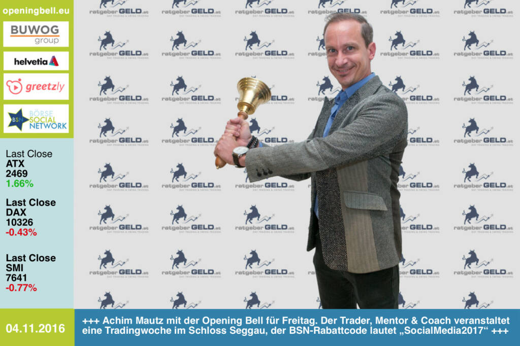 Opening Bell: Achim Mautz mit der Opening Bell für Freitag. Der bekannte Trader, Mentor & Coach veranstaltet im März 2017 eine Tradingwoche im Schloss Seggau, der BSN-Rabattcode in Höhe von 399 Euro lautet „SocialMedia2017“ http://ratgebergeld.at/boersenwoche-seggau/ http://www.openingbell.eu