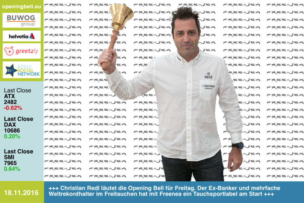Opening Bell: Christian Redl läutet die Opening Bell für Freitag. Der Ex-Banker und mehrfache Weltrekordhalter im Freitauchen hat mit Freenea ein Tauchsportlabel am Start http://www.freenea.com https://www.facebook.com/groups/Sportsblogged