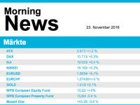 Die amerikanischen Aktienbenchmarks konnten gestern leicht zulegen. Sowohl der S&P 500 (+0,2%) als auch der Dow Jones (+0,4%) befinden sich mittlerweile auf neuen Höchstständen, die Erwartung einer expanisven Fiskalpolitik sowie die positive Berichtssaison in den USA dürften aktuell die Haupttreiber der positiven Kurentwicklung sein. Die positiven Vorgaben aus den USA sorgten heute Morgen in Asien ebenfalls für steigende Kurse. Auch die Aktienmärkte der Emerging Markets erholten sich in den letzten Tagen etwas, der MSCI EM verzeichnete gestern ein Plus von 1,2% und bei den meisten EM-Währungen ist aktuell eine Stabilisierung zu beobachten. Europa legt einen verhaltenen Start hin, ATX und DAX notieren leicht im Minus.