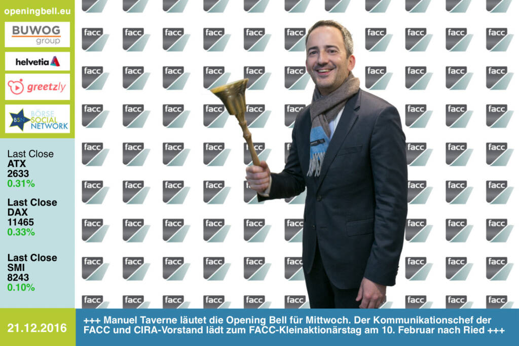 Opening Bell: Manuel Taverne läutet die Opening Bell für Mittwoch. Der Kommunikationschef der FACC und CIRA-Vorstand lädt zum FACC-Kleinaktionärstag am 10. Februar nach Ried http://www.facc.com/Aktuelles/Events/Kleinaktionaerstag , aktuelle Präsentation unter http://boerse-social.com/virtuellefinanzmarktmesse