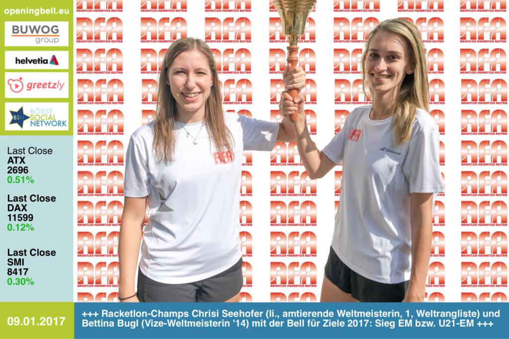 Opening Bell: Die Racketlon-Champs Chrisi Seehofer (li., amtierende Weltmeisterin, 1, Weltrangliste) und Bettina Bugl (Vize-Weltmeisterin 2014) mit der Opening Bell für Montag und die Ziele 2017: Sieg bei der EM bzw. U21-EM https://rfa.tournamentsoftware.com https://www.facebook.com/groups/Sportsblogged