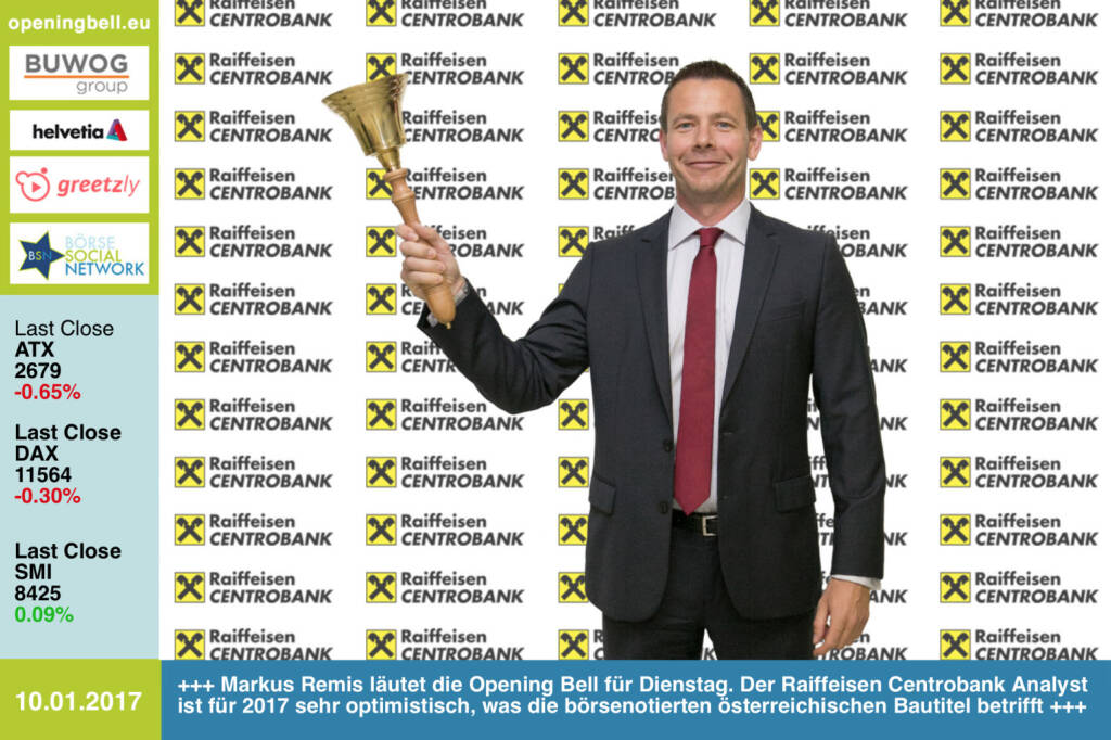 Opening Bell: Markus Remis läutet die Opening Bell für Dienstag. Der Raiffeisen Centrobank Analyst ist für 2017 sehr optimistisch, was die börsenotierten österreichischen Bautitel betrifft http://www.rcb.at https://www.facebook.com/groups/GeldanlageNetwork/
