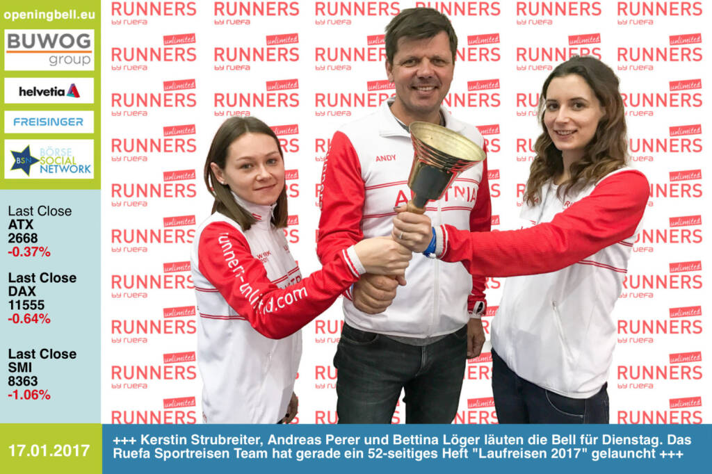 Opening Bell: Kerstin Strubreiter, Andreas Perer und Bettina Löger läuten die Opening Bell für Dienstag. Das Ruefa Sportreisen Team hat gerade ein 52-seitiges Heft "Laufreisen 2017" gelauncht http://www.runners-unlimited.com https://www.facebook.com/groups/Sportsblogged
